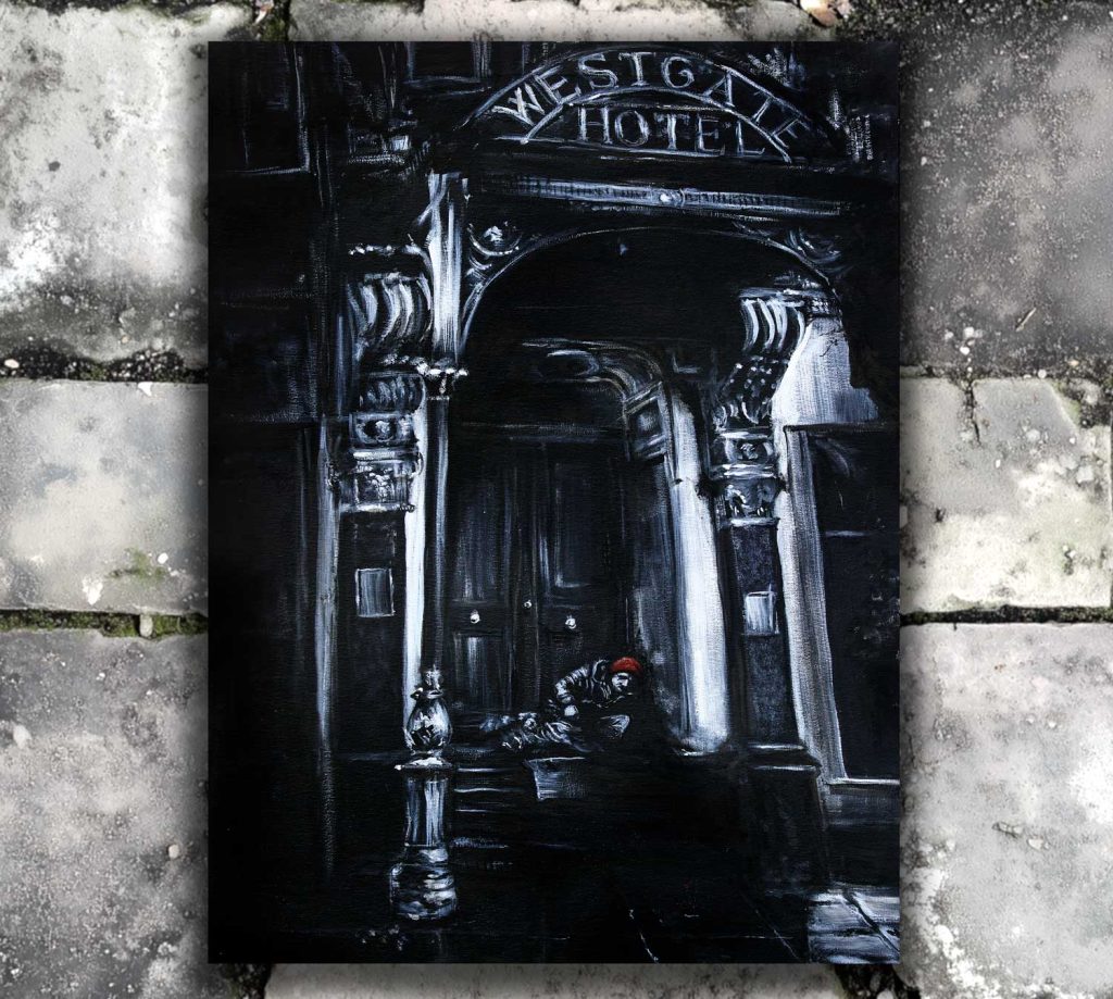 No Vacancies captures this stark contrast: the faded grandeur of a once-prestigious building, now serving as a refuge for a rough sleeper on its cold doorstep. Painted in black and white, the work strips away distraction and sentiment, leaving only truth and empathy.