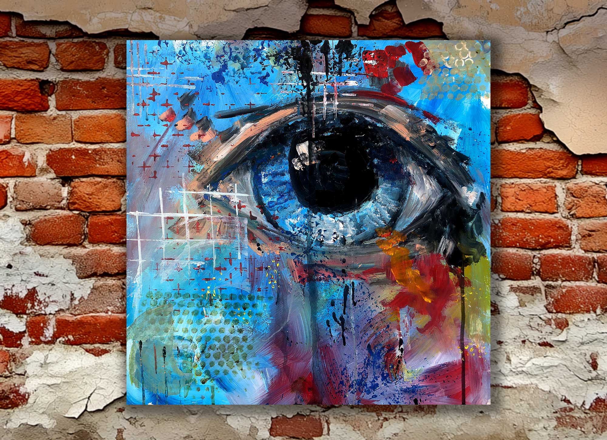Acrylic on canvas Grid Eye draws the viewer into a striking, central eye surrounded by grids, drips, and fractured colour. The composition …