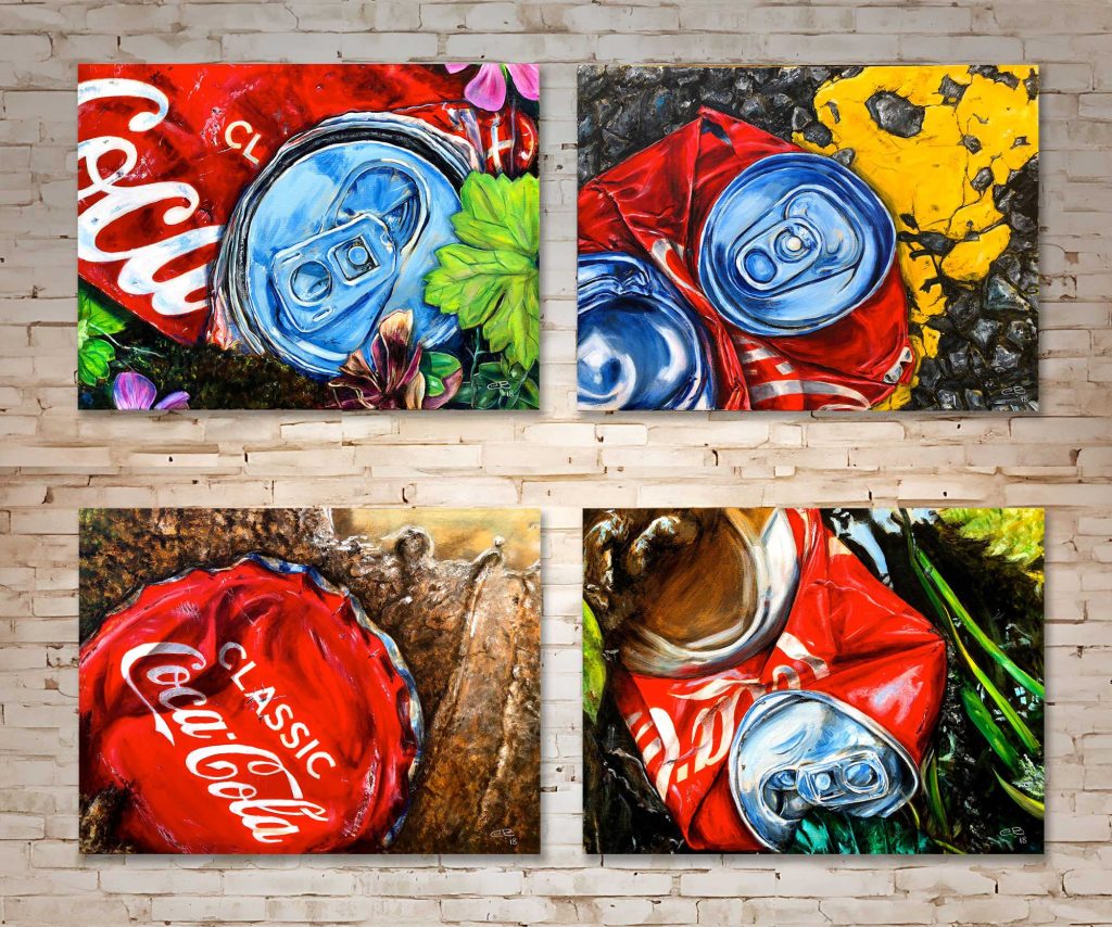 In this vibrant series of four acrylic paintings, discarded Coca-Cola cans — symbols of mass consumption and waste — are transformed into powerful works of art. Each crushed can lies partly submerged in earth, surrounded by soil, flowers, moss, and fractured stone. What once represented litter now becomes a meditation on renewal, resilience, and the quiet strength of nature.